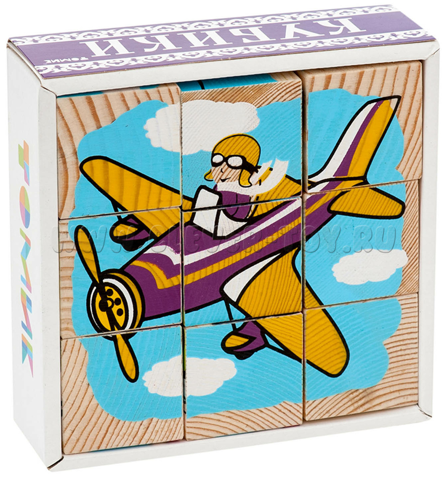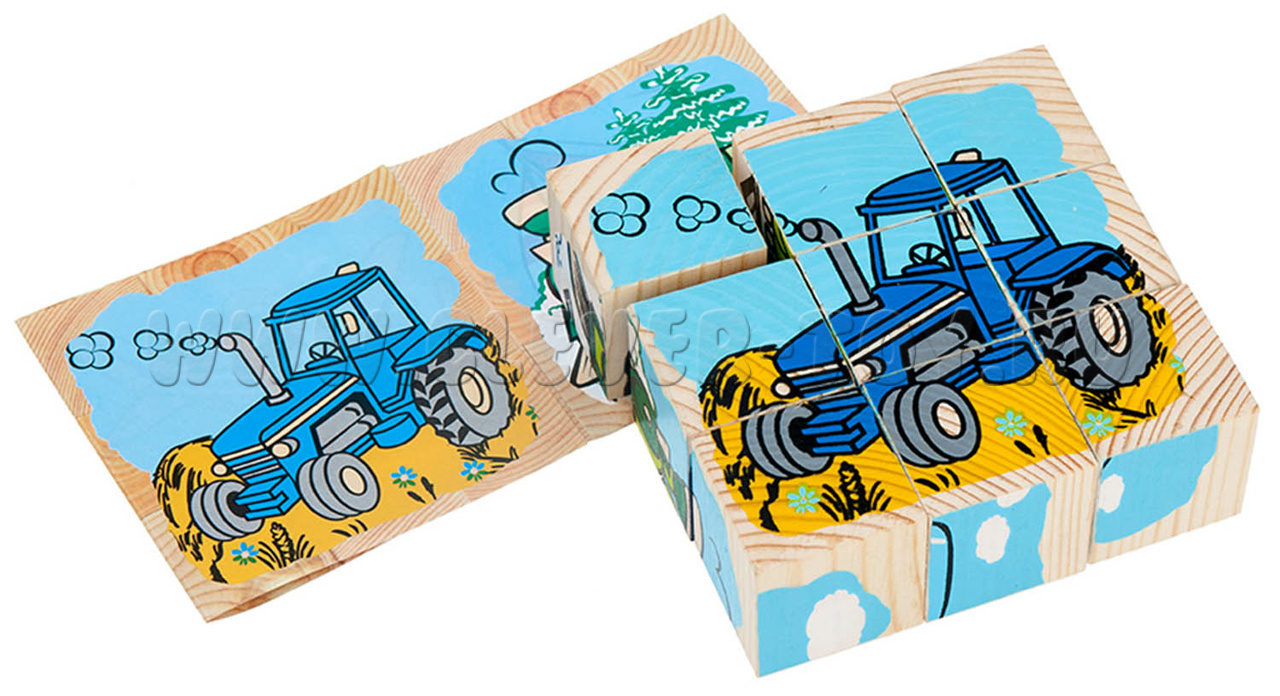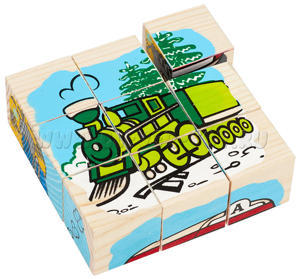 В состав входит девять кубиков, из которых ребенок может собрать 6 изображений транспортных средств.
