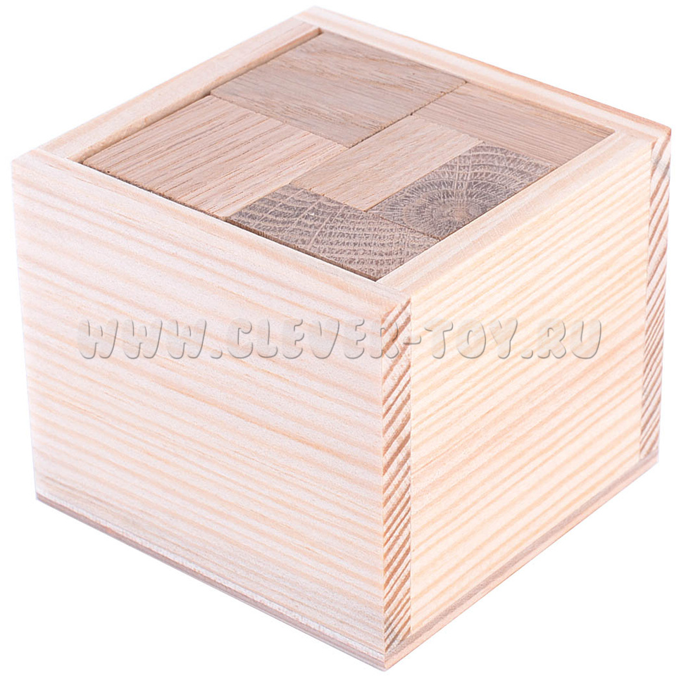 Гала куб состоит из 8 элементов и деревянной коробочки. Перед вами стоит две задачи. Сначала – упаковать все 8 элементов внутрь. А затем достать их выложить крест по толщине, равный ребру кубика.