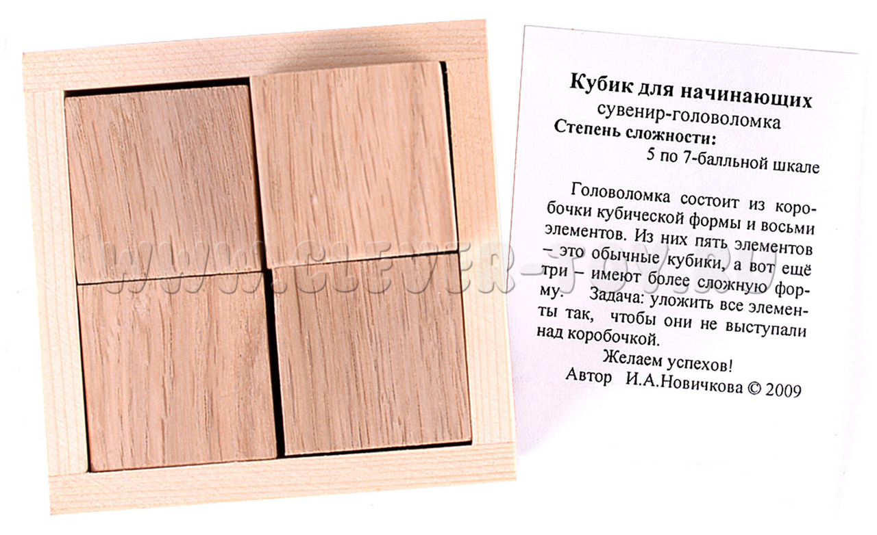 "Кубик для начинающих" - это оригинальная головоломка, созданная Ириной Новичковой. В комплекте имеется кубическая коробочка и 8 элементов, включая 5 обычных кубиков и 3 более сложных по форме.