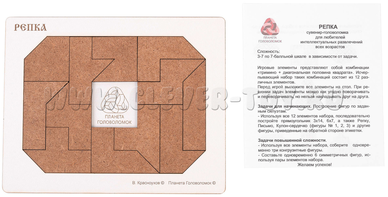 Для тех, кто только знакомится с головоломкой, есть задания попроще: нужно собрать фигуры по заданным силуэтам, используя все 12 элементов набора. Попробуйте последовательно сложить прямоугольник размером 3 х 14 или 6 х 7, а затем - более интересные фигуры: "Репку", "Письмо", "Кулон‑сердечко" и другие. Изображения всех этих силуэтов вы найдёте на обратной стороне этикетки, так что всегда будет понятно, к чему стремиться.