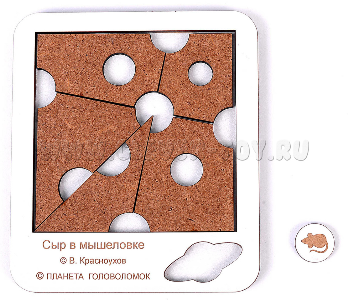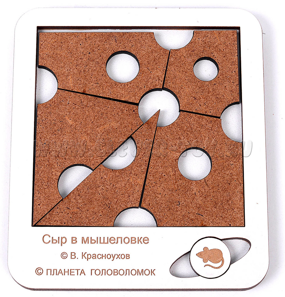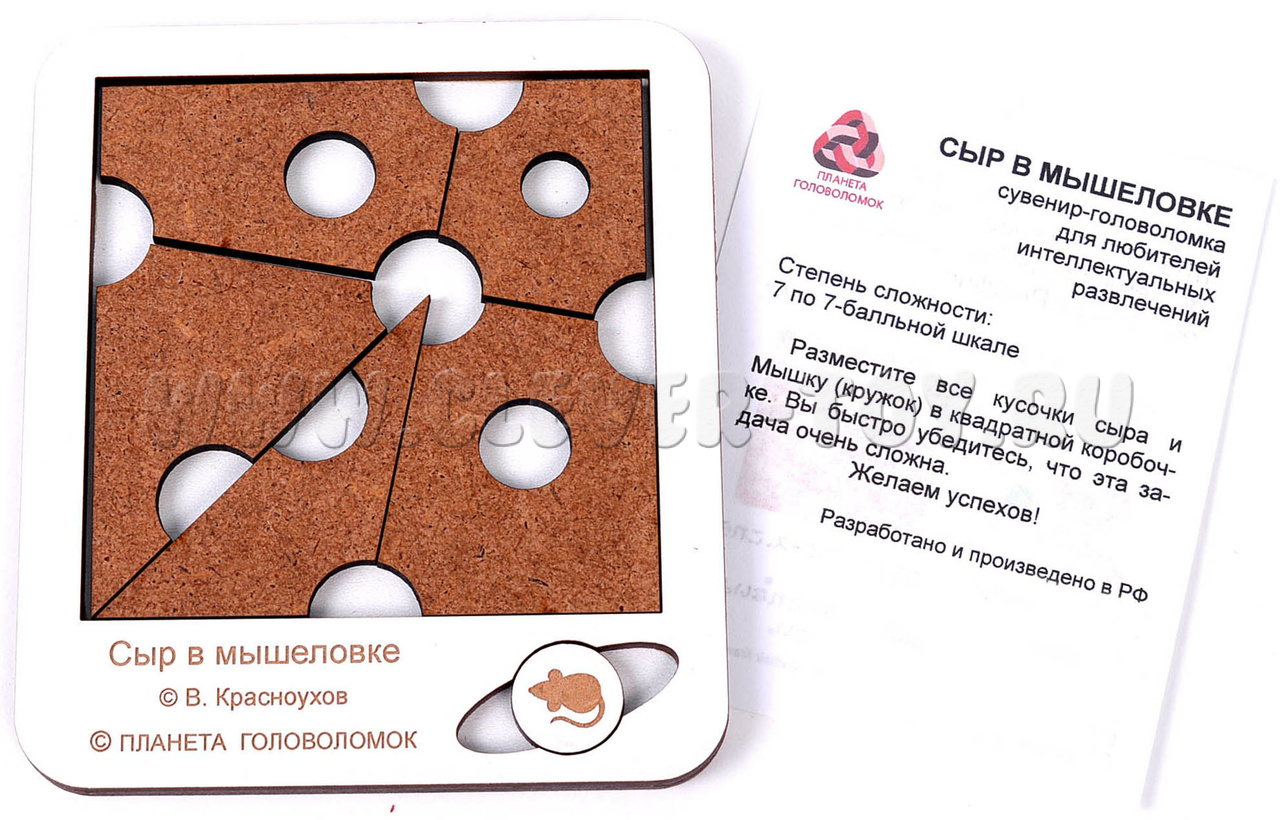 Головоломка "Сыр в мышеловке" представляет собой игру, в которой необходимо разместить все кусочки сыра и мышку внутри квадратной коробочки.