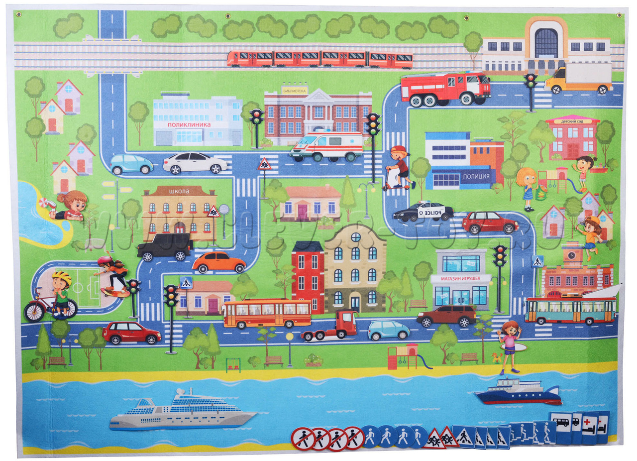 - игровое поле большого размера, выполненное в виде коврика с нарисованным на нём городом с дорогами, мостами, деревьями, зданиями;