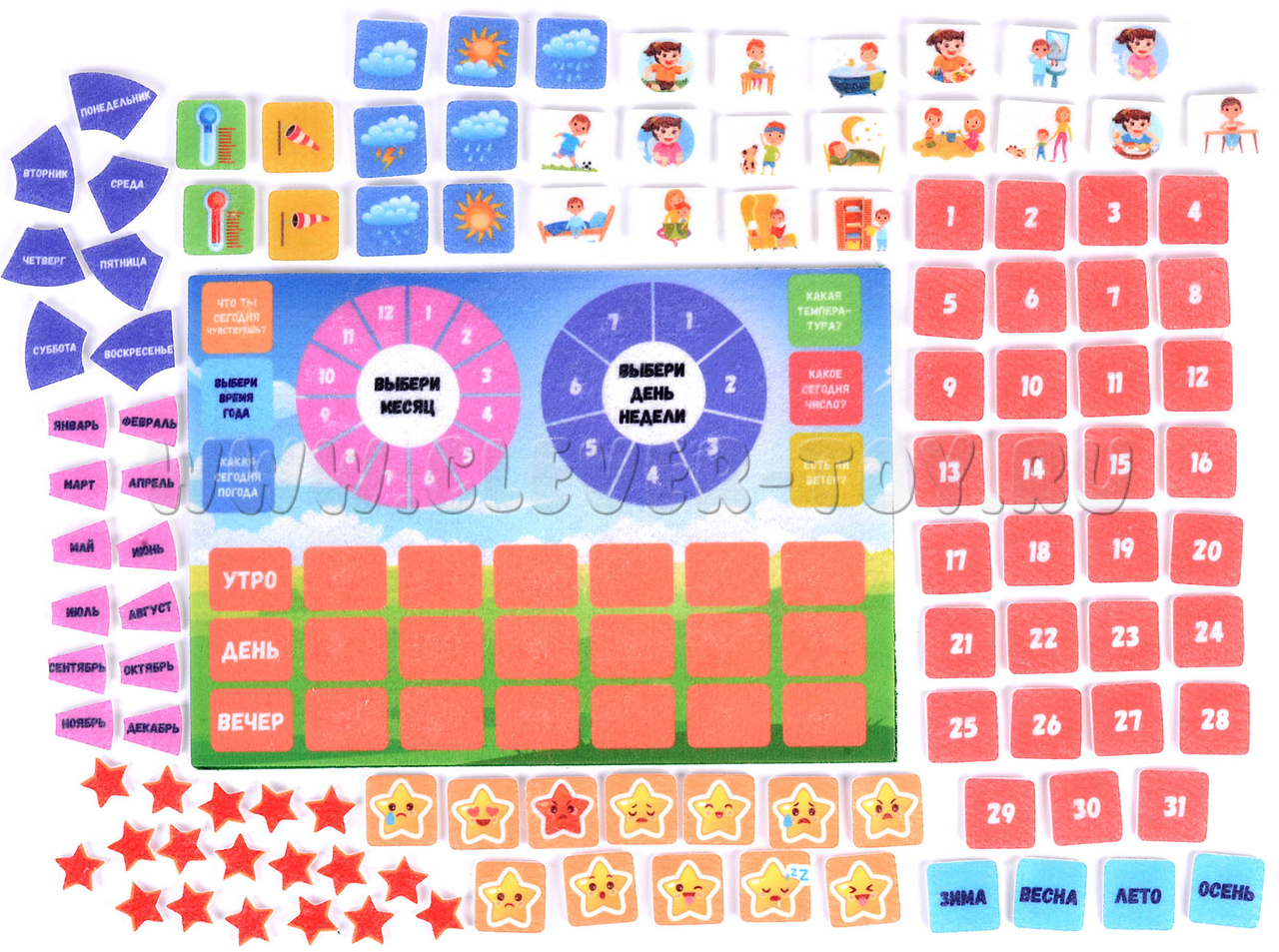 - Набор из 110 деталей (эмоции, осадки, ветер, температура, цифры, дни недели, месяцы, сезоны, распорядок дня, звездочки),