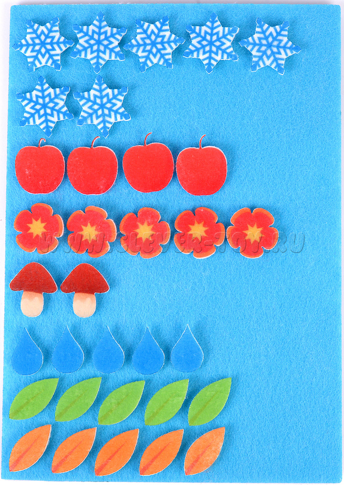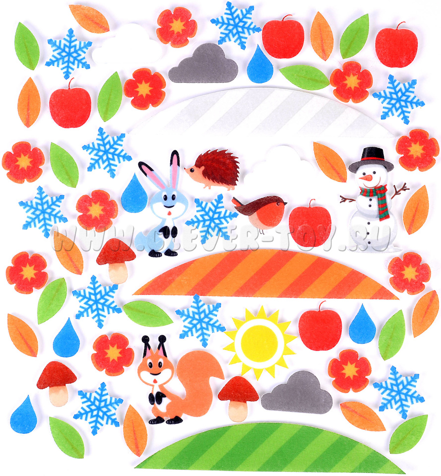 • разнообразные игровые элементы 4-х сезонов – зелёные и оранжевые листики, цветочки, яблочки, снежинки, облака, тучки, холмики, грибочки, дождевые капельки, солнце, ёжик, снеговик, белочка, зайчик, снегирь;