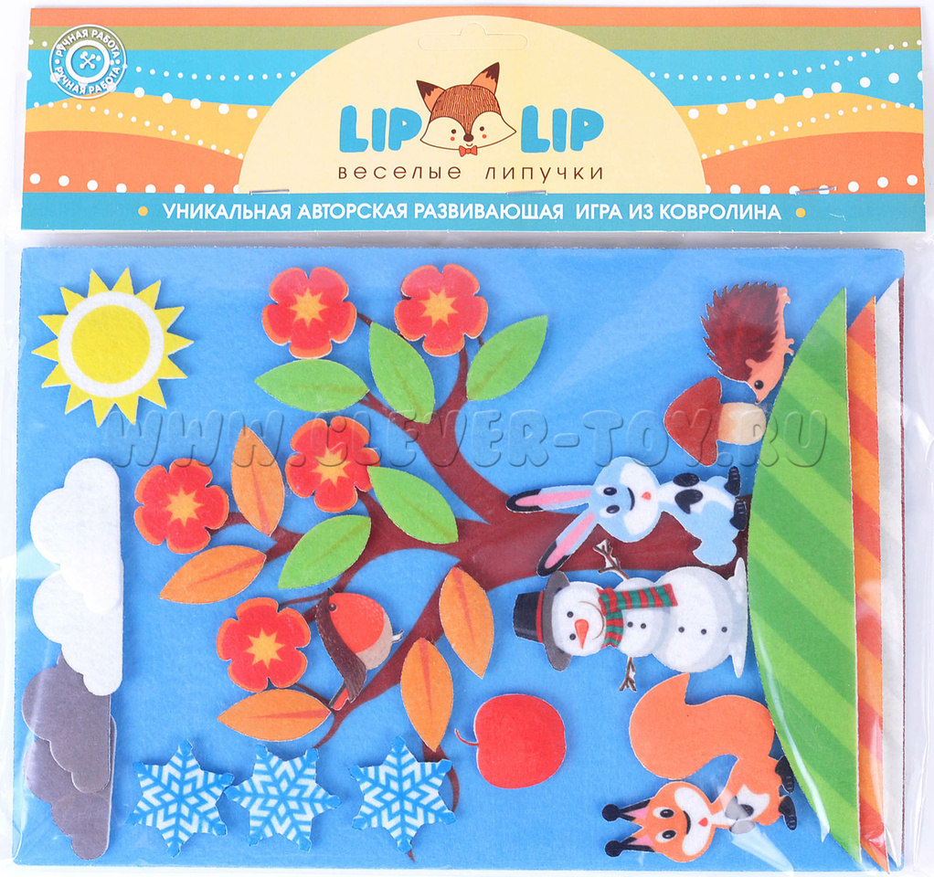 Все игровые элементы аппликации выполнены из современного материала – фетра. Он обладает рядом удивительных свойств: мягкий, яркий (окрашен безопасными красками), прочный и долговечный. Детали аккуратно вырезаны на специальном станке, легко крепятся на игровое поле с помощью липучек. На игровом поле сзади имеется специальный карман для хранения фигурок, чтобы они не терялись.