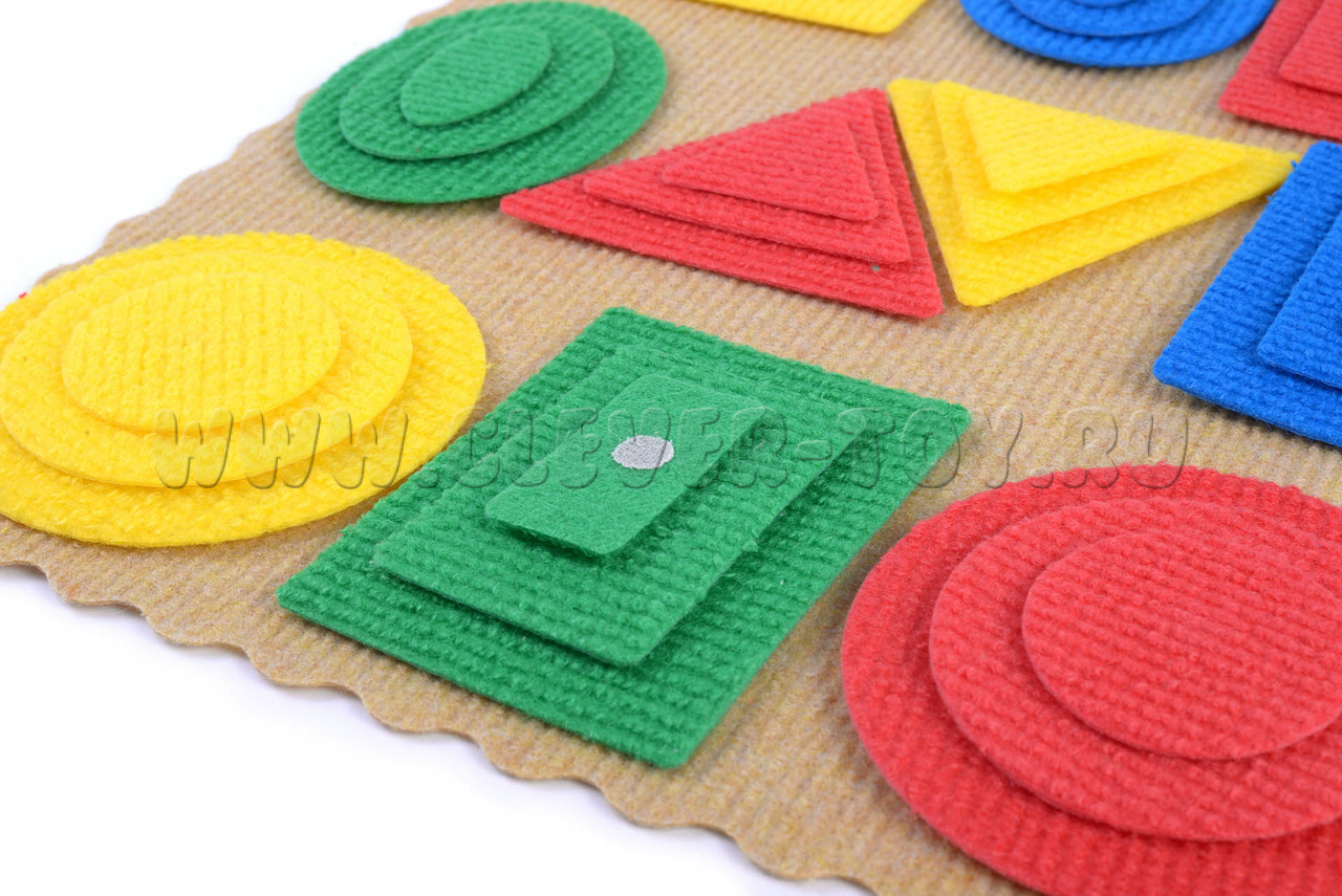 Разноцветные геометрические фигуры выполнены из безопасного современного материала – ковролина, аккуратно вырезаны на специальном станке, легко крепятся на ковролиную игровую основу с помощью многоразовых липучек.