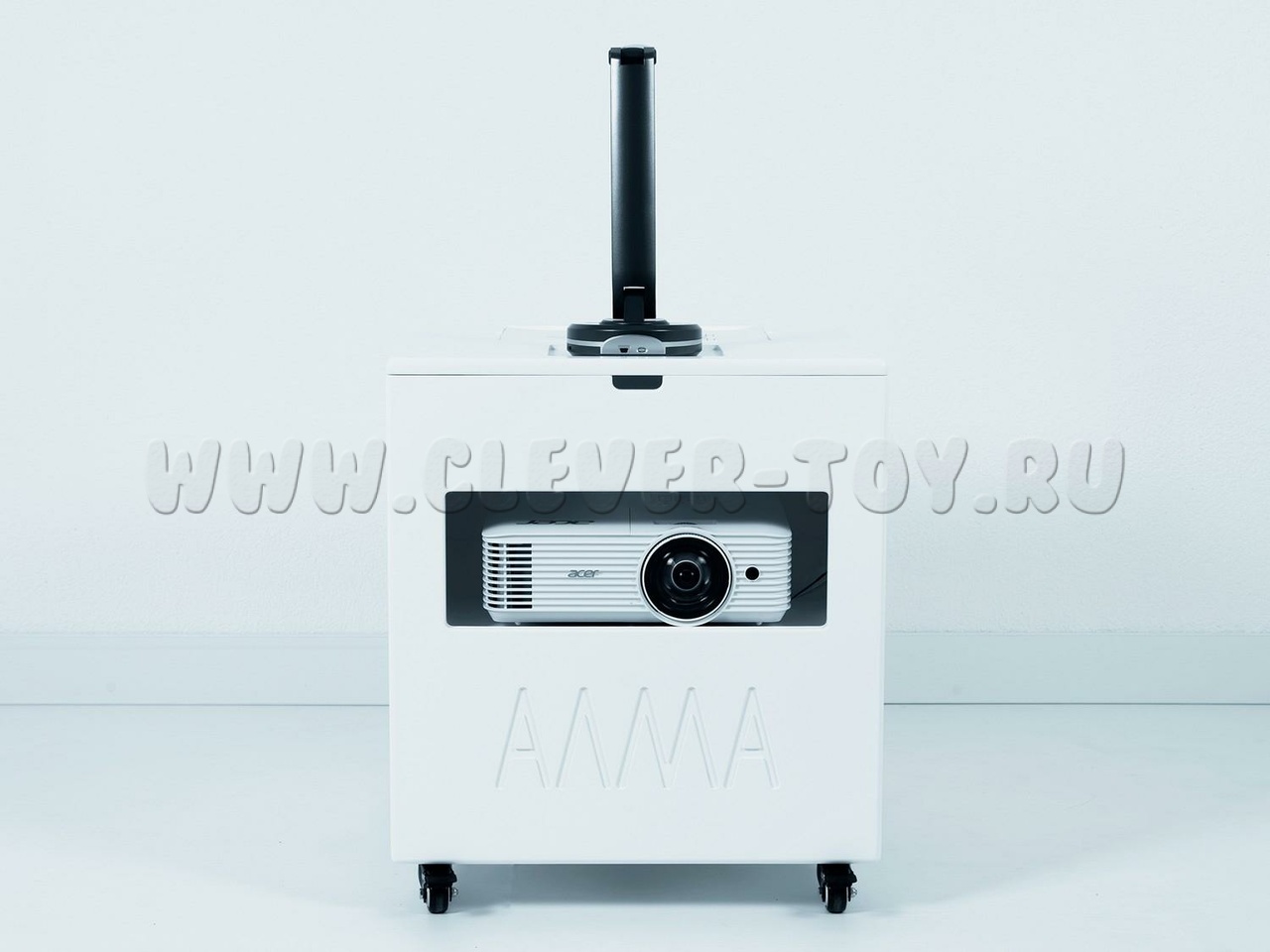 Благодаря подвижной платформе и компактным размерам оборудование легко перемещать между помещениями, а яркий проектор позволяет выводить изображение на различные поверхности.