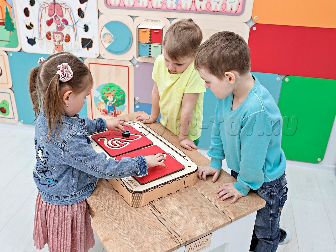Два лабиринта с изображениями, расположенными симметрично, вставляются в пазы, и ребёнок проходит их с помощью специальных пальчиковых фишек.