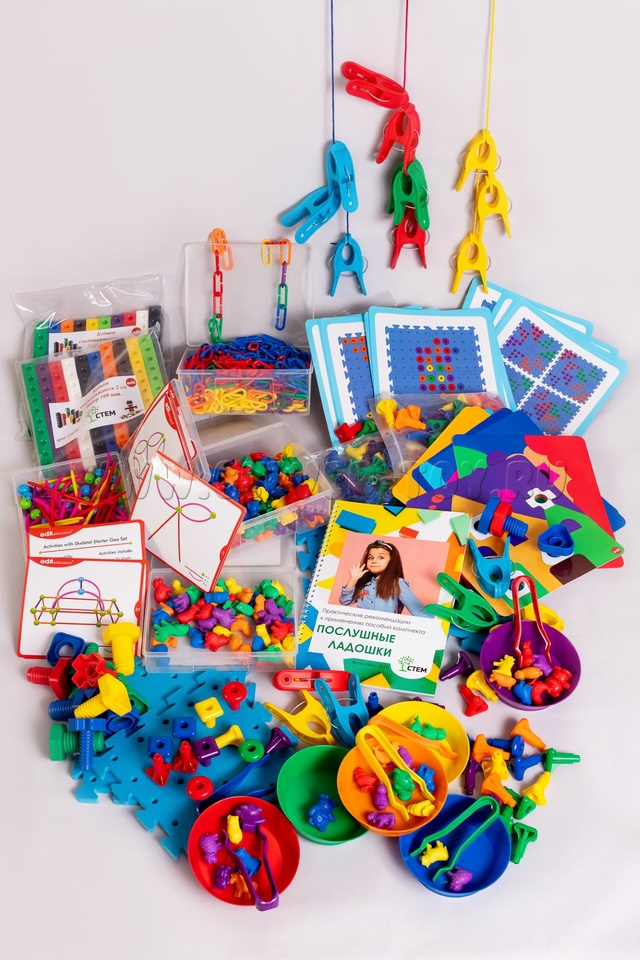 В комплекте 9 пособий компании EDX, решающих большинство задач развития мелкой моторики рук, и методическое пособие: