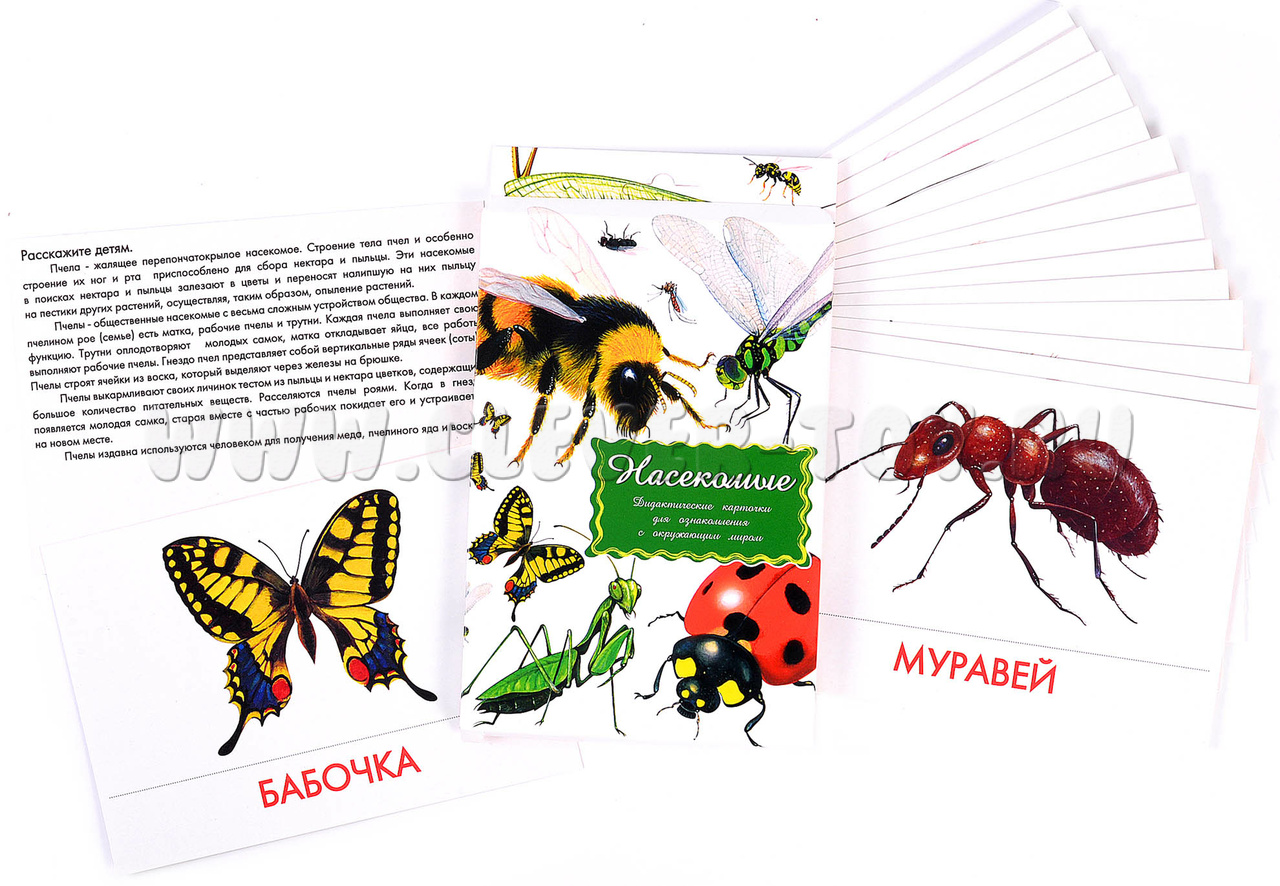 На одной стороне карточки расположена яркая картинка с изображением и названием насекомого (изображение детальное и реалистичное), на обратной стороне – доступная для ребёнка информация о насекомых (описывает внешний вид насекомого, ареал обитания, особенности питания и строения, интересные факты о происхождении насекомых). Карточки выполнены из прочного картона, подходят для многократного использования.