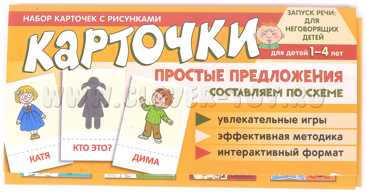 Задания в наборе представлены в игровой форме и помогают стимулировать речь у неговорящих детей, делая первые шаги к составлению простых предложений по схеме.