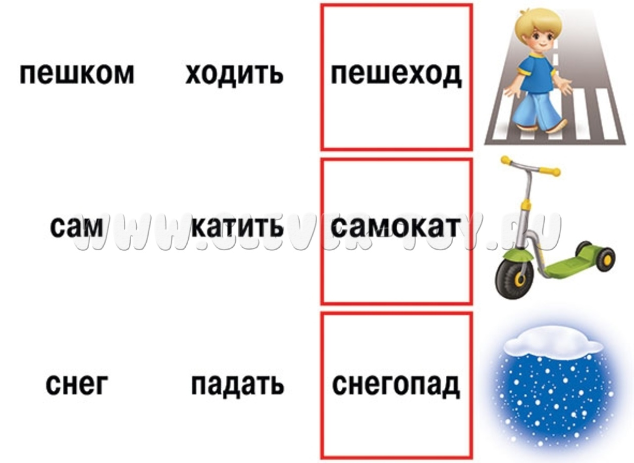 - Раздайте детям карточки со словами в красных рамках. Им необходимо подбрать подходящую к слову картинку и два слова-основы, из которых составлено слово в рамке;