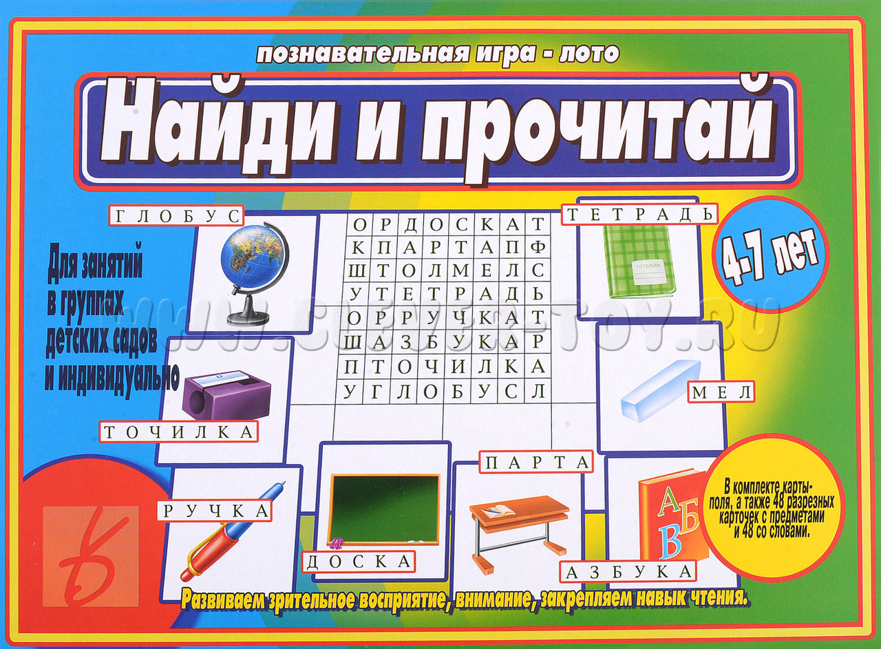 Перед вами игра для детей старшего дошкольного возраста. Она поможет развить зрительное восприятие, внимание и закрепить навыки чтения. Для начала игры разрежьте карточки по пунктирным линиям. В результате у вас получится 48 карточек с изображениями предметов и 48 карточек со словами.