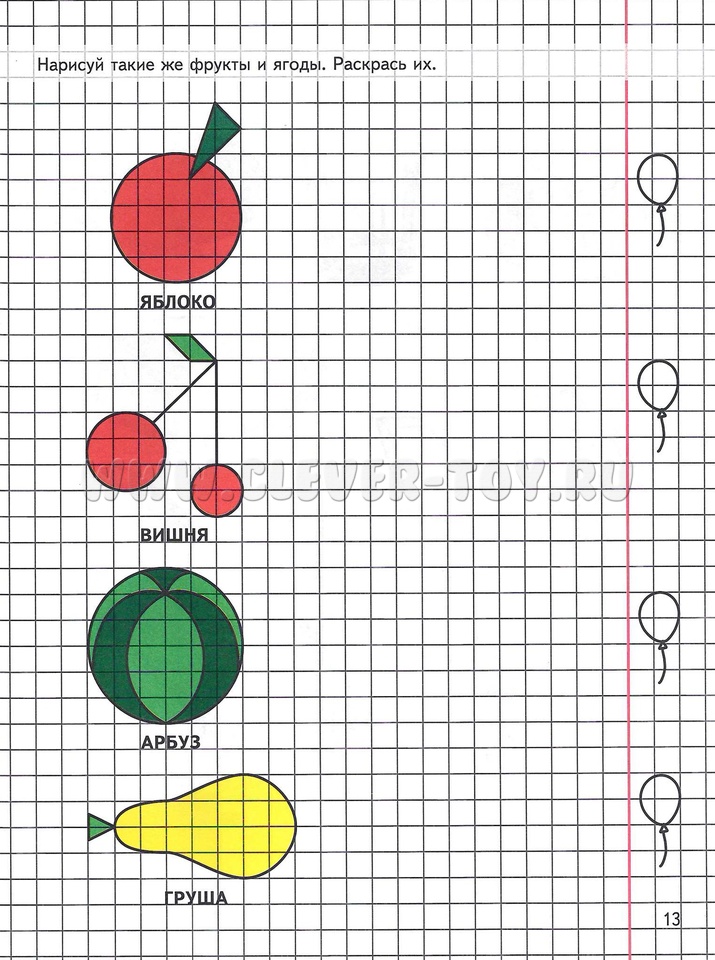 Для формирования навыка самоконтроля и самооценки рядом с каждым заданием на полях тетради нарисованы шарики: ребенок должен раскрасить их зеленым карандашом, если выполненный рисунок похож на образец (схематическое изображение); красным, если при рисовании были допущены ошибки.