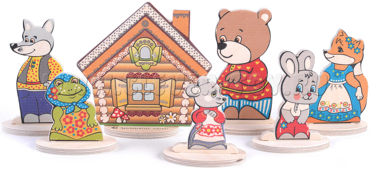 - 7 сказочных персонажей на подставках(заяц, мышка,лягушка, медведь, волк, лиса, теремок) от 6,5 до 12 см.;