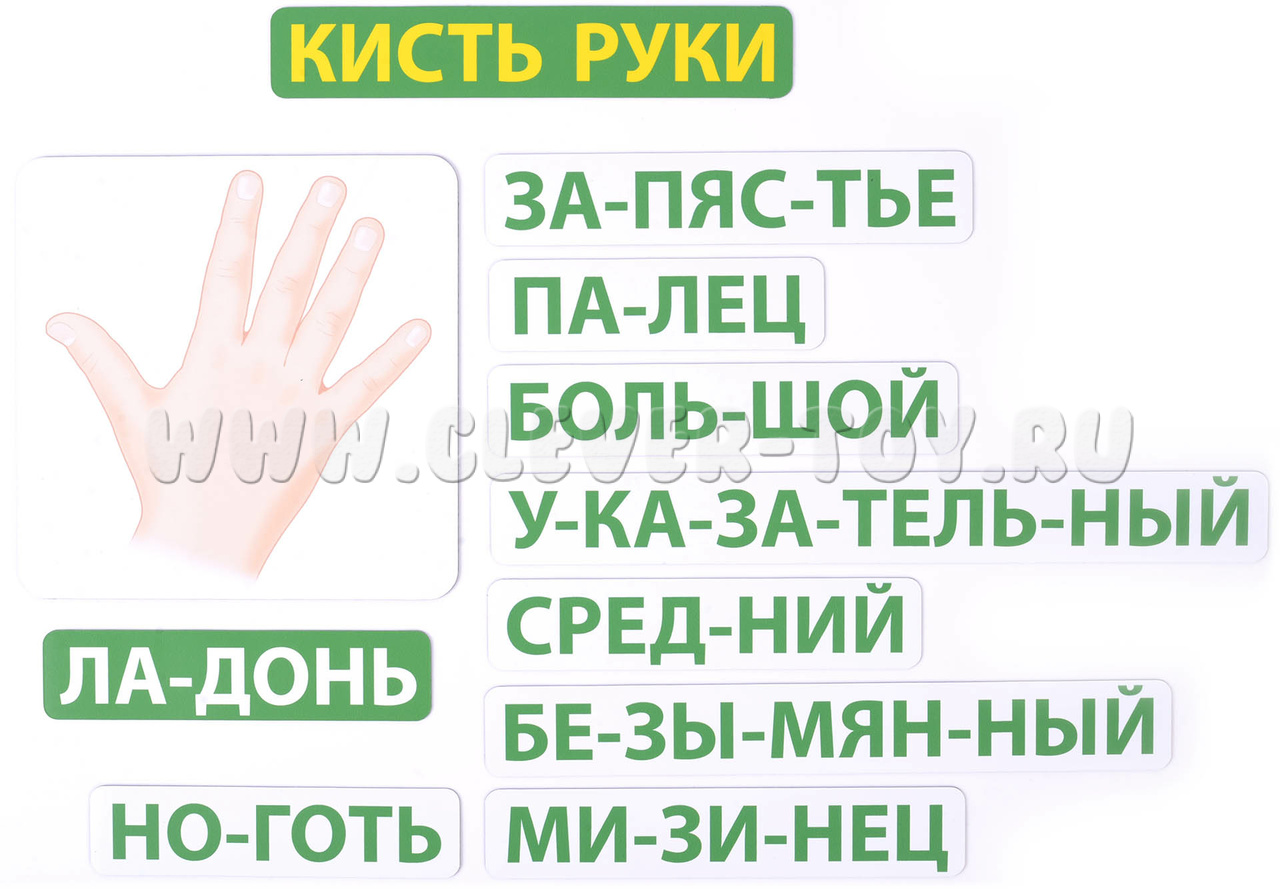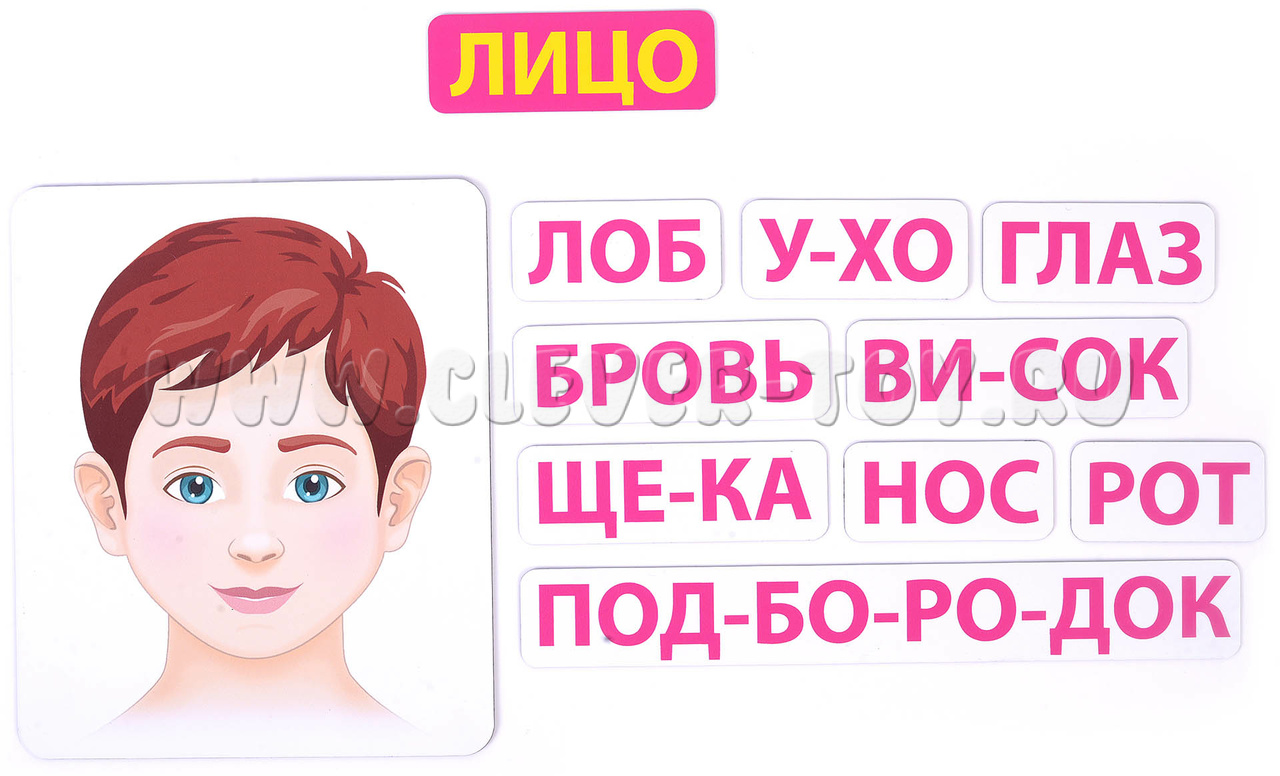 В наборе 88 магнитных карточек трёх видов: плакаты с изображением тела или его частей (сами служат магнитной основой); названия, разбитые по слогам; внутренние органы (знакомим с ними постепенно, по возрасту).
