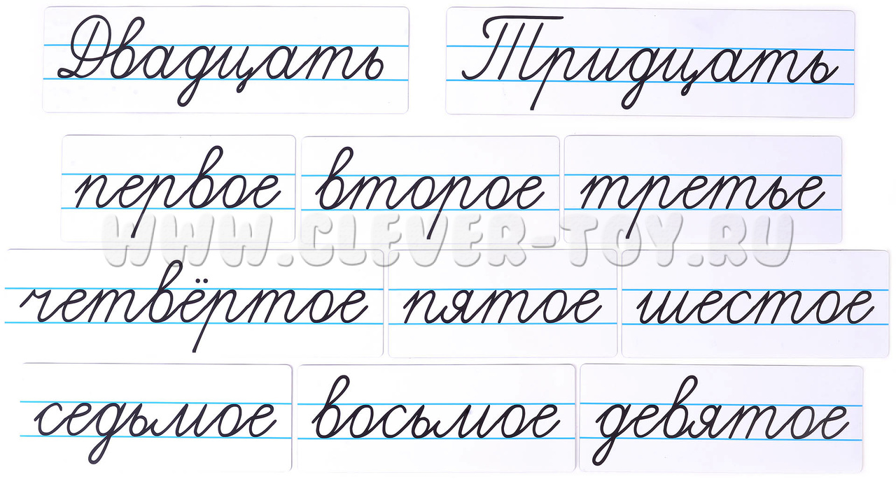 В комплект входят 32 карточки размером 9,5 см х 20-50 см. Высота букв 3 см.