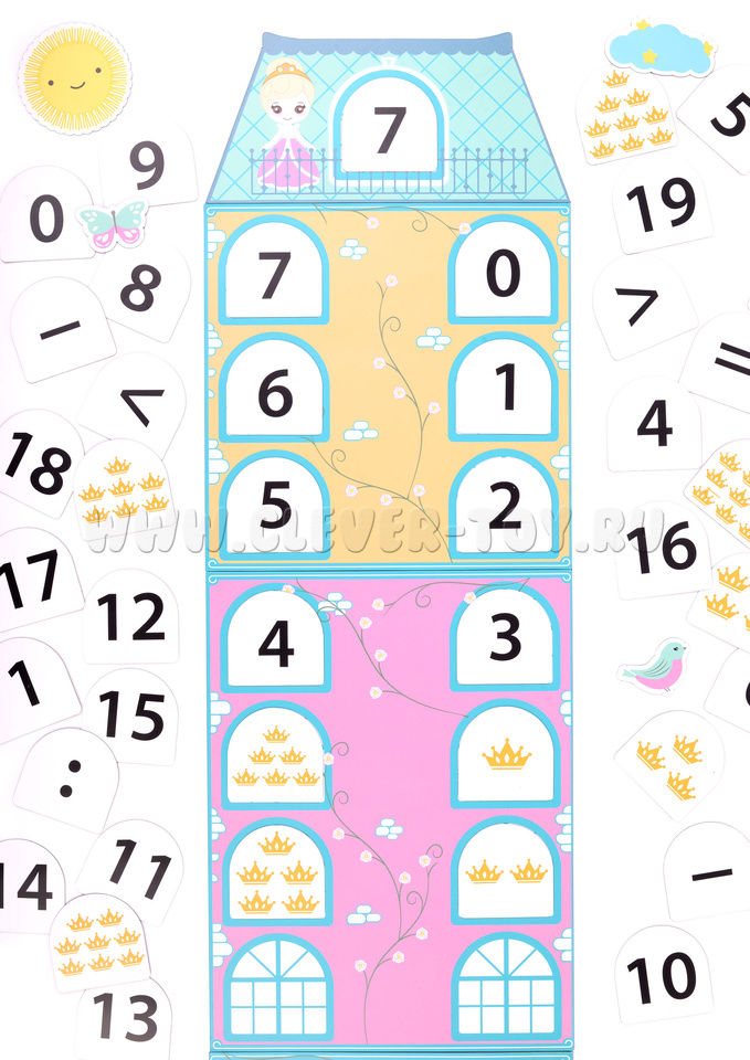 - Магнитные карточки с цифрами, знаками и коронами (соединяем абстракцию с предметным миром).