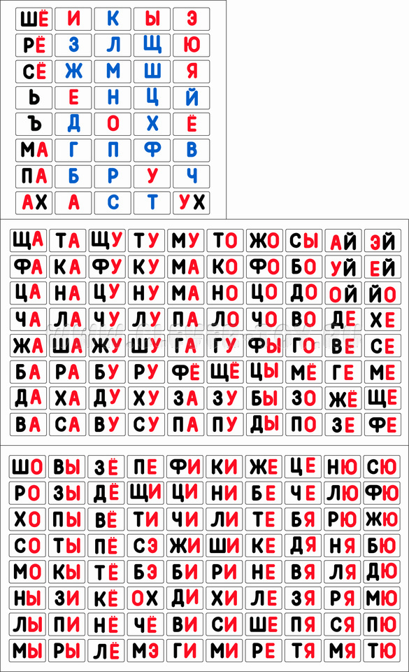 200 магнитных карточек со слогами и буквами.