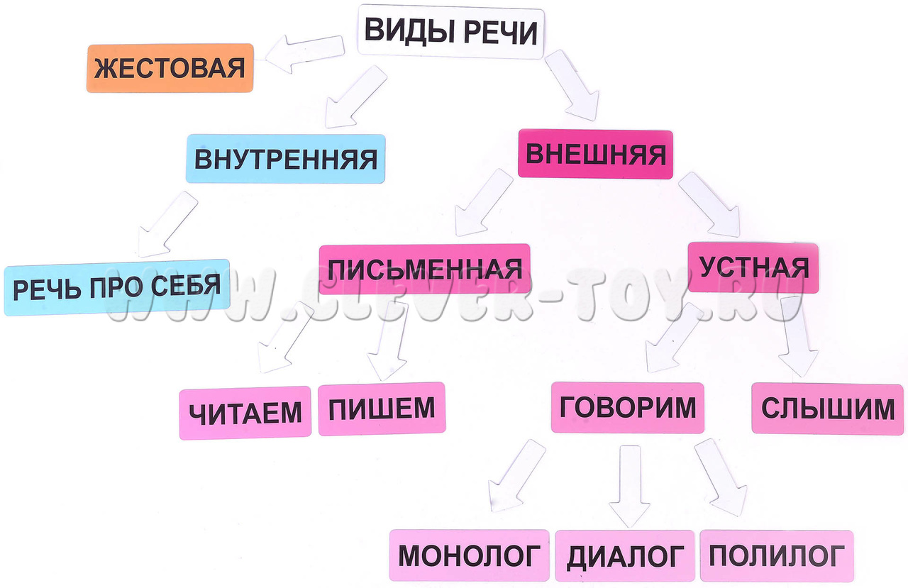 Как это работает: На магнитной доске ребята собирают схемы: слоги складываются в слова; слова - в предложения; предложения - в устную, письменную или внутреннюю речь. Цветные подсказки: Внешняя, внутренняя и жестовая речь выделены разными цветами - путаницы не будет. А магнитные стрелки помогут показать связи между понятиями (например, устная речь и монолог).
