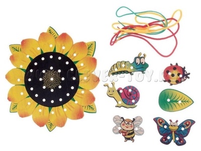Играя в шнуровку-подсолнух, вы можете придумать сказку, о том откуда прилетел на него листик, или же как на него заползла улитка, для чего на него прилетела пчела? и другое.